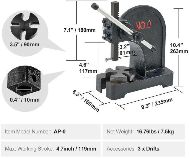 Max. Working Stroke: 4.7 inch / 119 mm,Plate Size: 3.5 inch/90 mm,Ram Length: 7.1 inch/180 mm,Throat Depth: 3.2 inch/81 mm,Item Model Number: AP-0,Ram Bore: 0.4 inch/10 mm,Net Weight: 16.53 lbs / 7.5 kg,Product Size: 9.3x6.3x10.4 inch / 235x160x263 mm