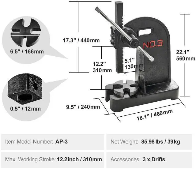 Max. Working Stroke: 12.2 inch / 310 mm,Plate Size: 6.5 inch/166 mm,Ram Length: 17.3 inch/440 mm,Throat Depth: 5.1 inch/130 mm,Item Model Number: AP-3,Ram Bore: 0.5 inch/12 mm,Net Weight: 85.98 lbs / 39 kg,Product Size: 18.1x9.5x22.1 inch / 460x240x560 mm