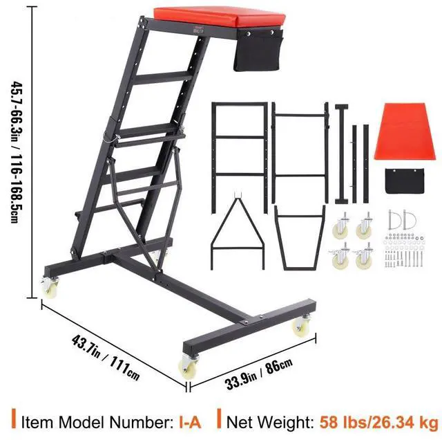 Angle Adjustment: 3,Capacity: 400 lbs,Height Range: 45.7-66.3 inch/1160-1685 mm,Item Model Number: I-A,Wheel Diameter: 4 in,Material: Q235A,Cushion Size: 12.4 x 18 inch/315 x 457 mm,Net Weight: 58 lbs/26.34 kg,Product Size: 43.7 x 33.9 x 66.3 inch/1110 x 860 x 1685 mm