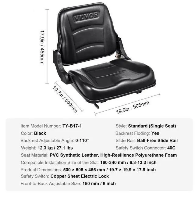 Color: Black,Safety Switch Connector: 40C,Product Dimensions: 520x505x455 mm/20.5x19.9x17.9 inch,Weight: 12.3 kg/27.1 lbs,Backrest Floding: Yes,Compatible Installation Size of the Slot: 160-340 mm/6.3-13.3 inch,Front-to-Back Adjustable Size: 150 mm/6 inch,Backrest Adjustable Angle: 0-110°,Item Model Number: TY-B17-1,Style: Standard (Single Seat),Slide Rail: Ball-Free Slide Rail,Seat Material: PVC Synthetic Leather, High-Resilience Polyurethane Foam,Safety Switch: Copper Sheet Electric Lock