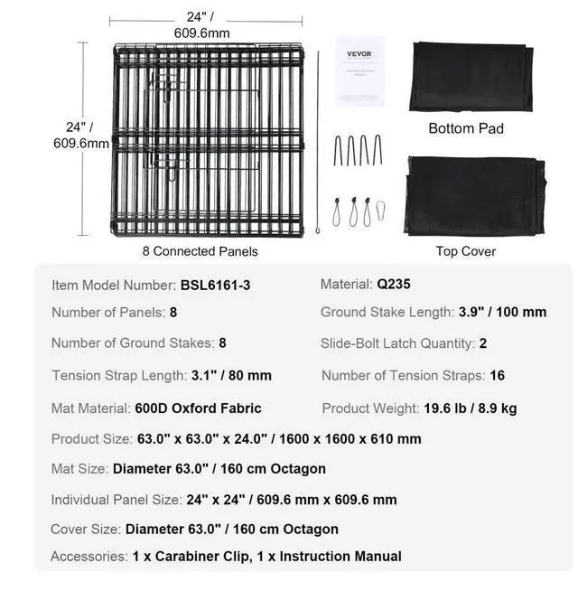 Number of Ground Stakes: 8,Number of Panels: 8,Ground Stake Length: 3.9" / 100 mm,Material: Q235,Product Size: 63.0" x 63.0" x 24.0" / 1600 x 1600 x 610 mm,Number of Tension Straps: 16,Mat Size: Diameter 63.0" / 160 cm Octagon,Slide-Bolt Latch Quantity: 2,Item Model Number: BSL6161-3,Cover Material: 600D Oxford Fabric, Mesh,Product Weight: 19.6 lb / 8.9 kg,Tension Strap Length: 3.1" / 80 mm,Cover Size: Diameter 63.0" / 160 cm Octagon,Individual Panel Size: 24" x 24" / 609.6 mm x 609.6 mm,Mat Material: 600D Oxford Fabric