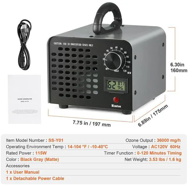 Ozone Output: 36000 mg/h,Voltage: AC120V 60Hz,Item Model Number: SS-Y01,Rated Power: 115W,Product Dimensions: 6.89 x 7.75 x 6.30 in / 175 x 197 x 160 mm,Net Weight: 3.53 lbs / 1.6 kg,Timer Function: 0-120 Minutes Timing,Operating Environment Temp: 14-104 °F / -10-40