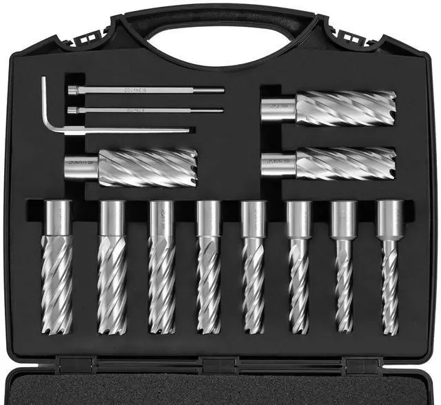 Carrying Case Dimensions: 11.02 x 9.25 x 2.76 in / 280 x 235 x 70 mm,Net Weight (Including All Accessories): 3.7 lbs / 1.68 kg,Cutting Depth: 2",Item Model Number: 10190010214,Material: High-Speed Steel M2AL,Shank Type: Weldon Shank,Hardness: HRC62.5-67.5,Blade Length (Include Shank): 3.41" / 86.5 mm,Cutting Diameter: 7/16", 1/2", 9/16", 11/16", 5/8", 3/4", 13/16", 7/8", 15/16", 1", 1-1/16"