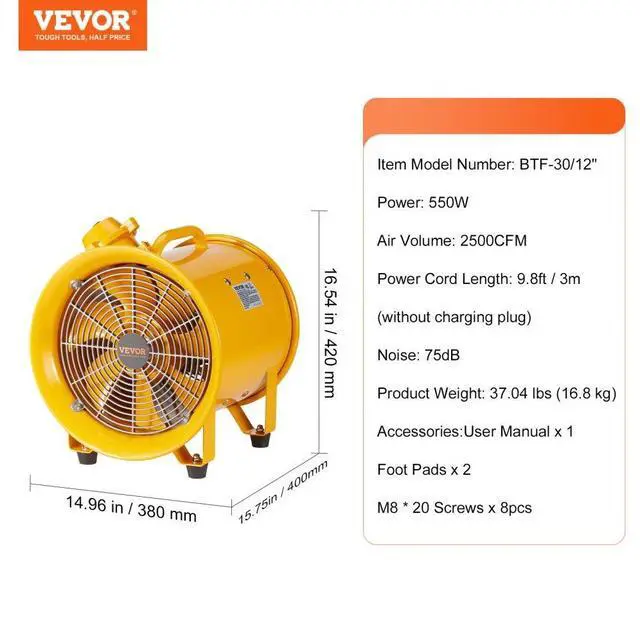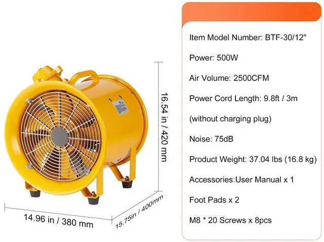 Power Cord Length: 9.8ft / 3m (without charging plug),Speed: 2850rpm,Air Volume: 2500CFM,Noise: 75dB,Item Model Number: BTF-30/12",Product Weight: 37.04 lbs (16.8 kg),Product Dimensions: 15.75 x 14.96 x 16.54 inches (400 x 380 x 420 mm),Power: 550W,Power Supply: AC120V 60Hz
