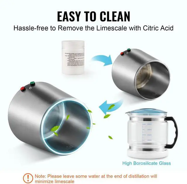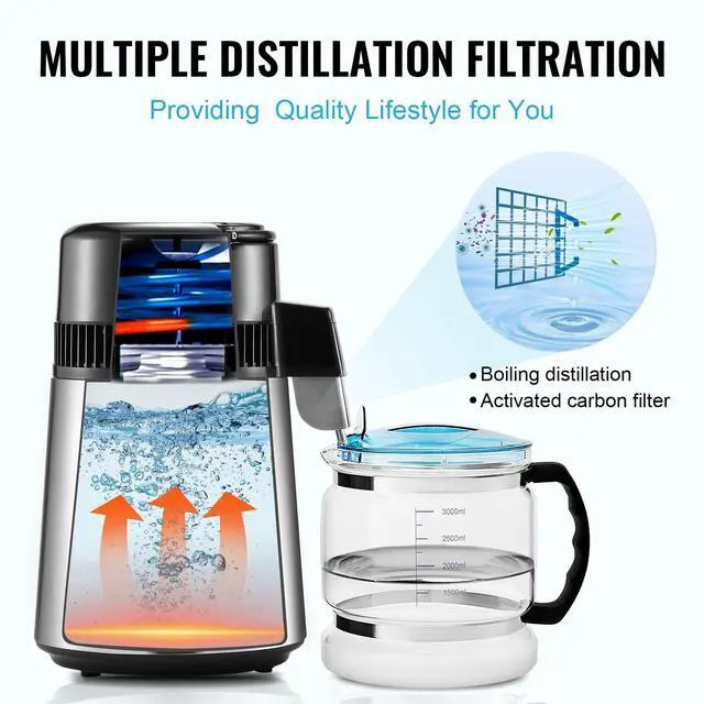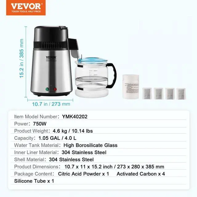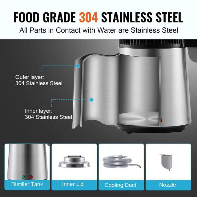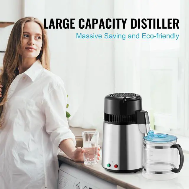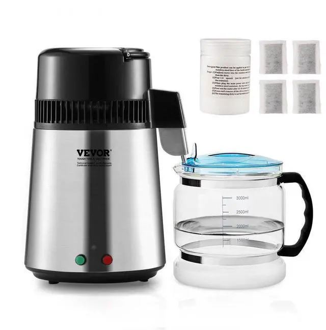 VEVOR Water Distiller, 4L 1.05 Gallon Pure Water Purifier Filter For Home Countertop, 750W Distilled Water Maker, Stainless Steel Interior Distiller Water Making Machine to Make Clean Water, Silvery