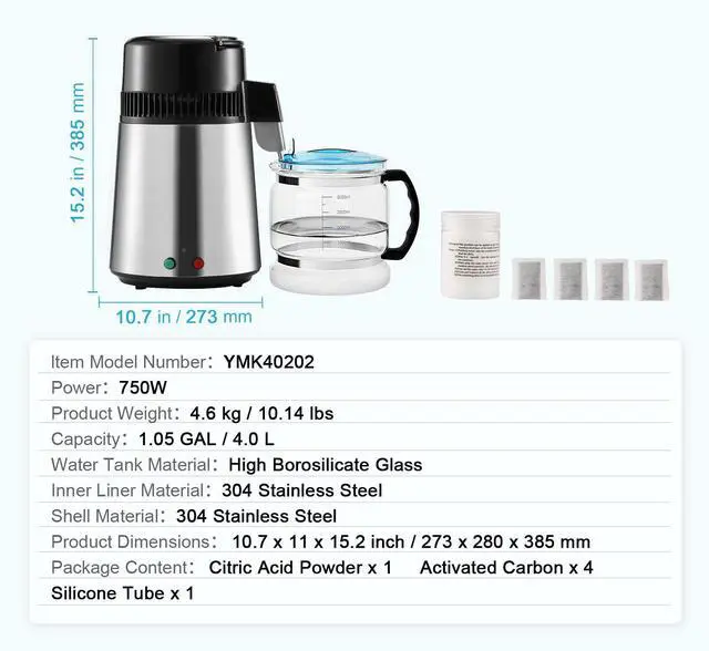 Inner Liner Material: 304 Stainless Steel,Capacity: 1.05 GAL / 4.0 L,Water Tank Material: High Borosilicate Glass,Item Model Number: YMK40202,Product Weight: 4.6kg / 10.14 lbs,Shell Material: 304 Stainless Steel,Power: 750W
