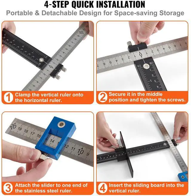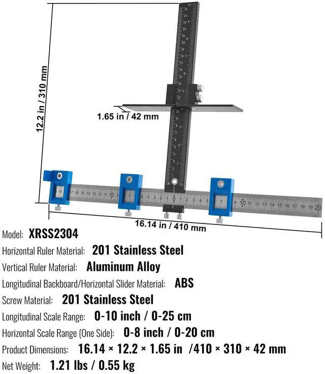 Longitudinal Backboard/Horizontal Slider Material: ABS,Item Model Number: XRSS2304,Product Dimensions (L x W x He): 16.14 x 12.2 x 1.65 in /410 x 310 x 42 mm,Screw Material: 201 Stainless Steel,Vertical Ruler Material: Aluminum Alloy,Longitudinal Scale Range: 0-10 inch / 0-25 cm,Horizontal Ruler Material: 201 Stainless Steel,Net Weight (Including all accessories): 1.21 lbs / 0.55 kg,Horizontal Scale Range (One Side): 0-8 inch / 0-20 cm