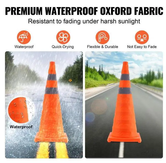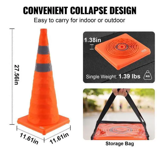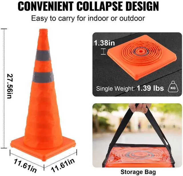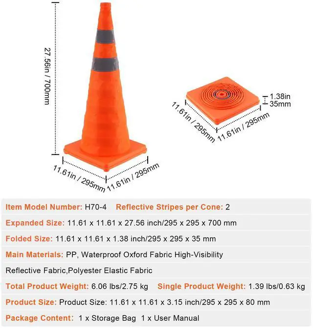 Expanded Size: 11.61 x 11.61 x 27.56 inch/295 x 295 x 700 mm,Cone Size: 11.02 x 11.02 x 27.56 inch/280 x 280 x 700 mm,Main Materials: PP, Waterproof Oxford Fabric, High-Visibility Reflective Fabric, Polyester Elastic Fabric,Single Product Weight: 1.39 lbs/0.63 kg,Reflective Stripes per Cone: 2,Base Size: 11.61 x 11.61 inch/295 x 295 mm,Item Model Number: H70-4,Folded Size: 11.61 x 11.61 x 1.38 inch/295 x 295 x 35 mm,Total Product Weight: 6.06 lbs/2.75 kg,Product Size: 11.61 x 11.61 x 6.3 inch/295 x 295 x 160 mm