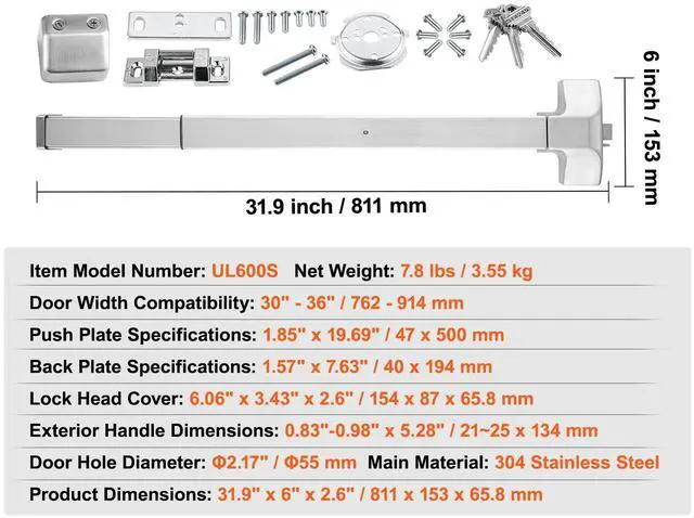 Lock Head Cover: 6.06" x 3.43" x 2.6" / 154 x 87 x 65.8 mm,Door Hole Diameter: 2.17" / 55 mm,Item Model Number: 600S,Push Plate Specifications: 1.85" x 19.69" / 47 x 500 mm,Door Width Compatibility: 30" - 36" / 762 - 914 mm,Product Dimensions: 31.9" x 6" x 2.6" / 811 x 153 x 65.8 mm,Back Plate Specifications: 1.57" x 7.63" / 40 x 194 mm,Net Weight: 7.8 lbs / 3.55 kg,Main Material: 304 Stainless Steel,Exterior Handle Dimensions: 0.83"-0.98" x 5.28" / 21-25 x 134 mm