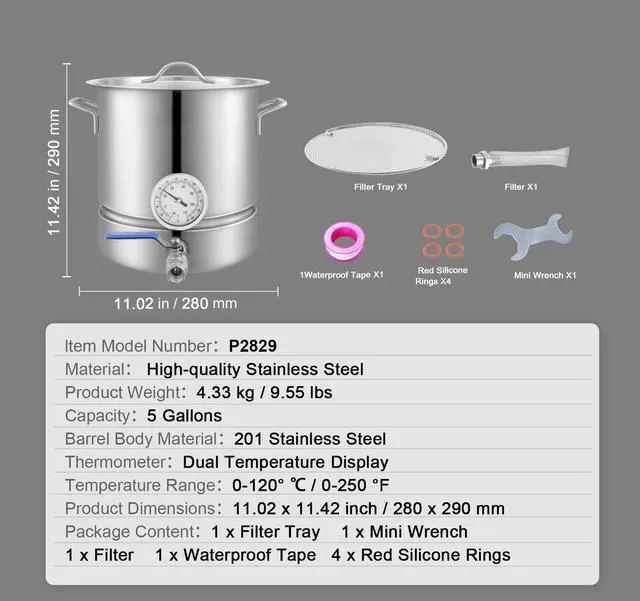 Thermometer: Dual Temperature Display,Capacity: 5 Gallons / 18.92 L,Item Model Number: P2829,Product Weight: 4.33 kg / 9.55 lbs,Temperature Range: 0-120/0-250°F,Material: High-quality Stainless Steel,Barrel Body Material: 201 Stainless Steel,Product Dimensions: 280x290 mm / 11.02"x11.42"