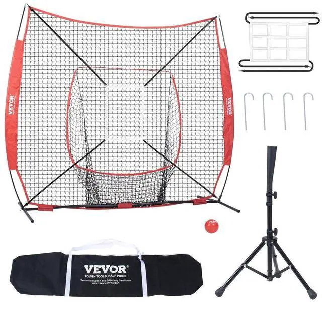 VEVOR 7x7 ft Baseball Softball Practice Net, Portable Baseball Training Net for Hitting Batting Catching Pitching, Backstop Baseball Equipment with Bow Frame, Carry Bag, Strike Zone, Ball, Batting Tee