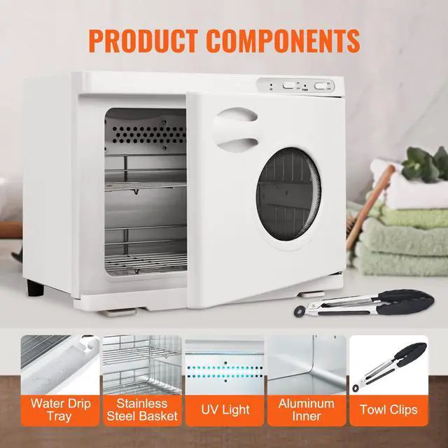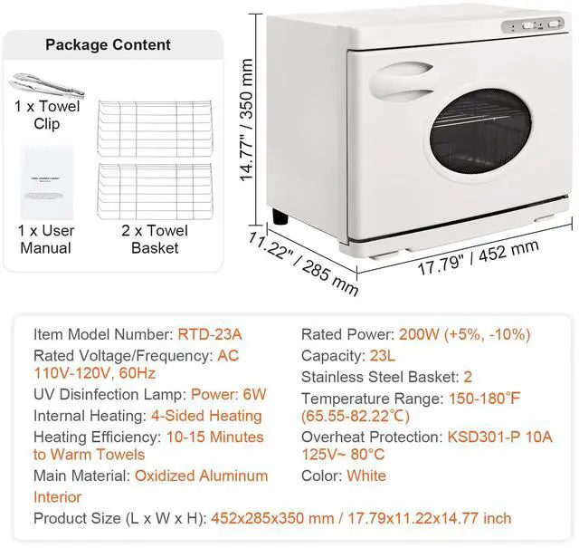 Stainless Steel Basket: 2,UV Light: Yes, Power: 6W,Color: White,Rated Voltage/Frequency: AC 110V-120V, 60Hz,Transparent Window: Yes, to Monitor Towel Quantity,Product Size (L x W x H): 452x285x350 mm/17.79x11.22x14.77 inch,Capacity: 23L,Item Model Number: RTD-23A,Temperature Range: 150-180 (65.55-82.22),Heating Efficiency: 10-15 Minutes to Warm Towels,Rated Power: 200W (+5%, -10%),Overheat Protection: Yes, KSD301-P 10A 125V~ 80°C,Main Material: Oxidized Aluminum Interior,Internal Heating: 4-Sided Heating
