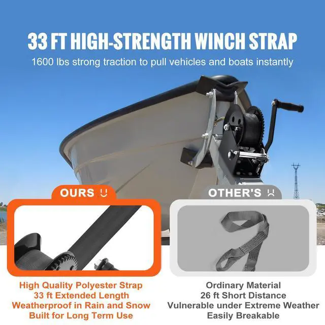 VEVOR Hand Winch, 1600 lbs Pulling Capacity, Boat Trailer Winch Heavy Duty Rope Crank with 33 ft Polyester Strap and Two-Way Ratchet, Manual Operated Hand Crank Winch for Trailer, Boat or ATV Towing