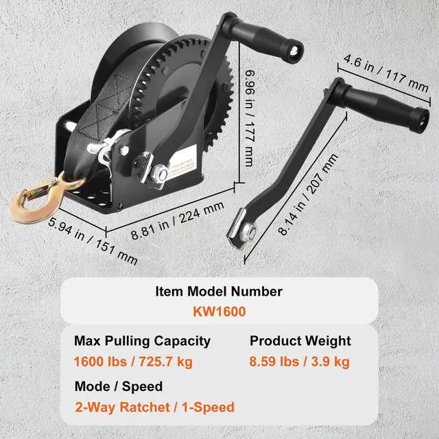 Handle Size: 8.14 x 4.6 in/207 x 117 mm,Max Pulling Capacity: 1600 lbs/725.7 kg,Item Model Number: KW1600,Product Weight: 8.59 lbs/3.9 kg,Mode/Speed: 2-Way Ratchet/1-Speed,Product Size: 8.81 x 5.94 x 6.96 in/224 x 151 x 177 mm