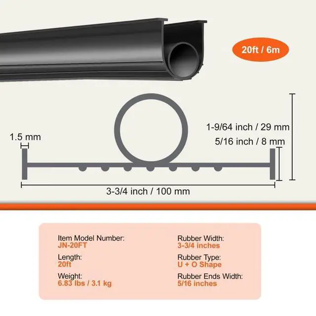 Item Model Number: JN-20FT Length: 20 ft / 6 m Type: U + O Shape Rubber Width: 3-3/4 inch / 100 mm Rubber Ends Width: 5/16 Inch / 8 mm Weight: 6.83 lbs / 3.1 kg