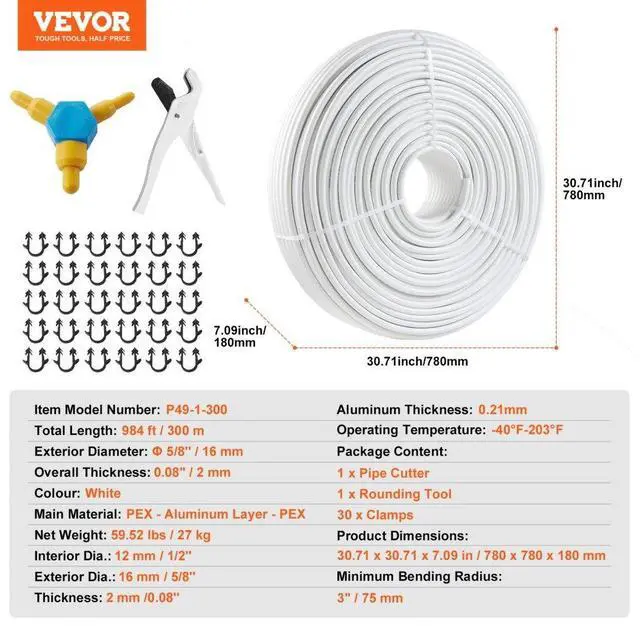 Total Length: 984 ft / 300 m,Overall Thickness: 0.08'' / 2 mm,Exterior Diameter: 5/8'' / 16 mm,Color: White,Item Model Number: P49-1-300,Product Dimensions: 30.71 x 30.71 x 7.09 in / 780 x 780 x 180 mm,Net Weight: 59.52 lbs / 27 kg,Main Material: PEX - Aluminum Layer - PEX