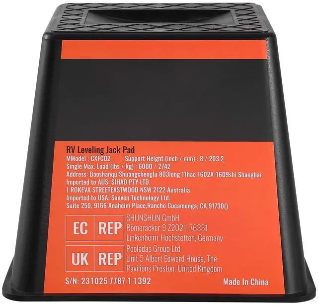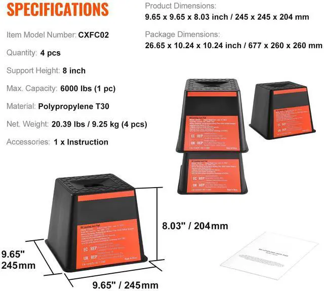 Package Dimensions: 26.65 x 10.24 x 10.24 inch/677 x 260 x 260 mm,Support Height: 8 inch,Item Model Number: CXFC02,Quantity: 4 pcs,Net. Weight: 20.39 lbs/9.25 kg,Material: Polypropylene T30,Max. Capacity: 6000 lbs,Product Dimensions: 9.65 x 9.65 x 8.03 inch/245 x 245 x 204 mm