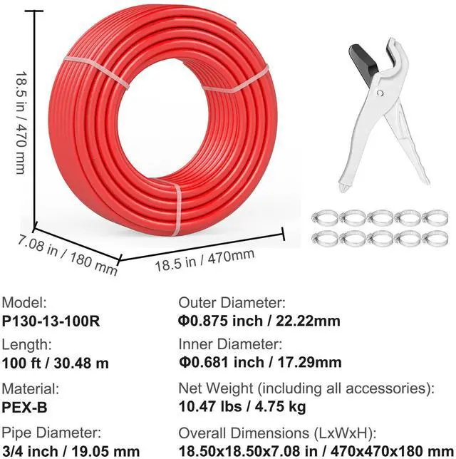 Outer Diameter: 0.875 inch / 22.22 mm,Overall Dimensions (LxWxH): 18.50x18.50x7.08 inch / 470x470x180 mm,Net Weight (including all accessories): 10.47 lbs / 4.75 kg,Length: 100 ft / 30.48 m,Inner Diameter: 0.681 inch / 17.29 mm,Pipe Diameter: 3/4 inch / 19.05 mm,Model: P130-13-100R,Material: PEX-B