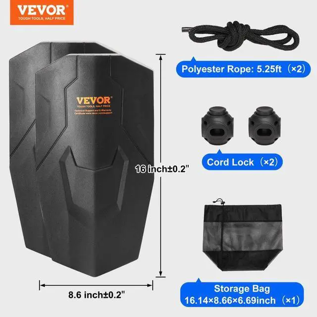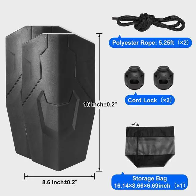 Storage Bag Size: 16.14×8.66×6.69 inch/410×220×170mm,Color: Black,Item Model Number: 80E20A,Fender Size: 8.6" x 16" inch (±0.2"),Quantity: 2 pcs,Material: EVA,Net Weight: 4.67 lbs/2.12 kg (all accessories included),Rope Length: 5.25 ft/1.6 m