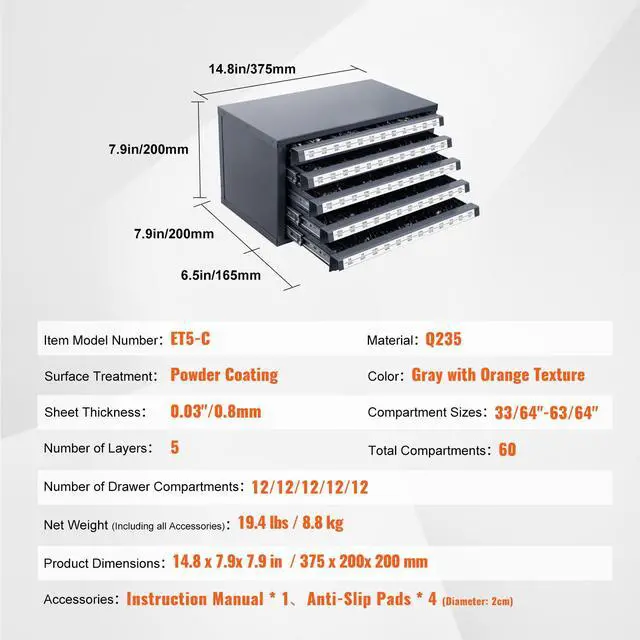 Number of Layers: 5,Net Weight (Including all Accessories): 19.4 lbs / 8.8 kg,Compartment Sizes: 33/64"-63/64",Color: Gray with Orange Texture,Total Compartments: 60,Item Model Number: ET5-C,Surface Treatment: Powder Coating,Material: Q235,Sheet Thickness: 0.03"/0.8mm,Number of Drawer Compartments: 12/12/12/12/12,Product Dimensions: 14.8 x 7.9x 7.9 in / 375 x 200x 200 mm