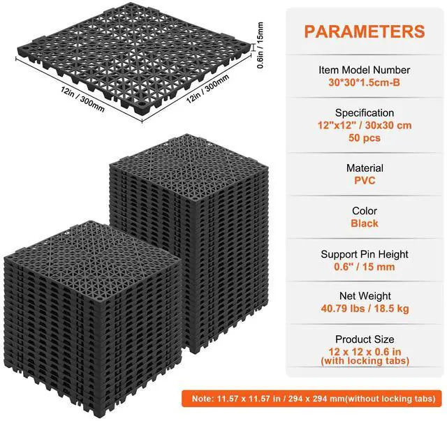 Support Pin Height: 0.6''/15 mm,Color: Black,Item Model Number: 30*30*1.5cm-B,Specification: 12"x 12"/30 x 30 cm, 50 pcs,Material: PVC,Net Weight: 40.79 lbs/18.5 kg,Product Size: 12 x 12 x 0.6 inch/300 x 300 x15 mm