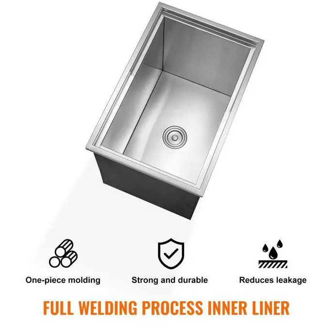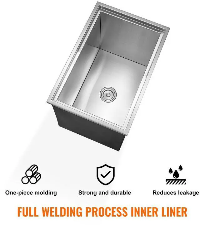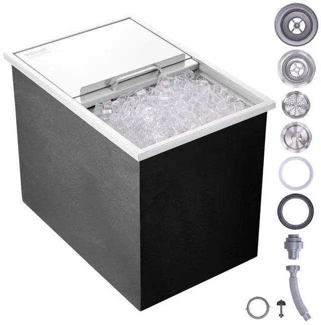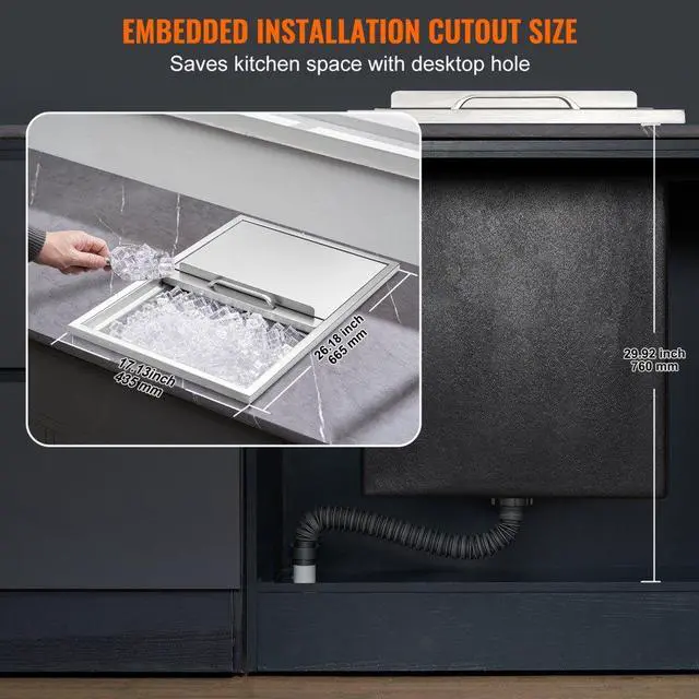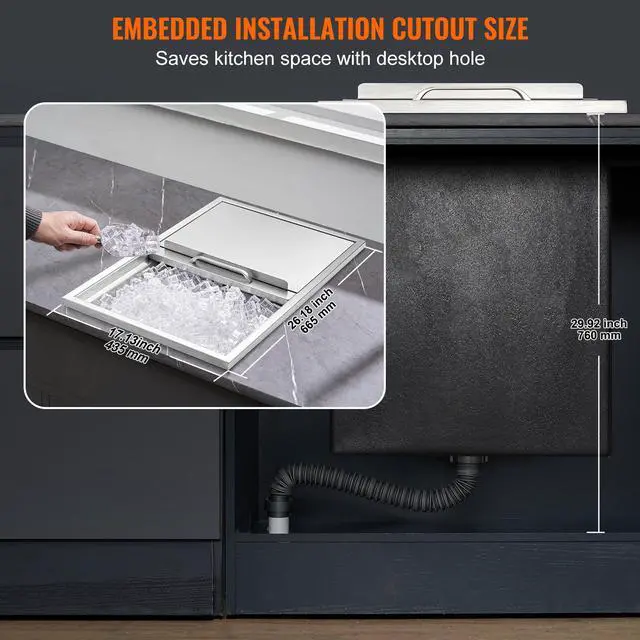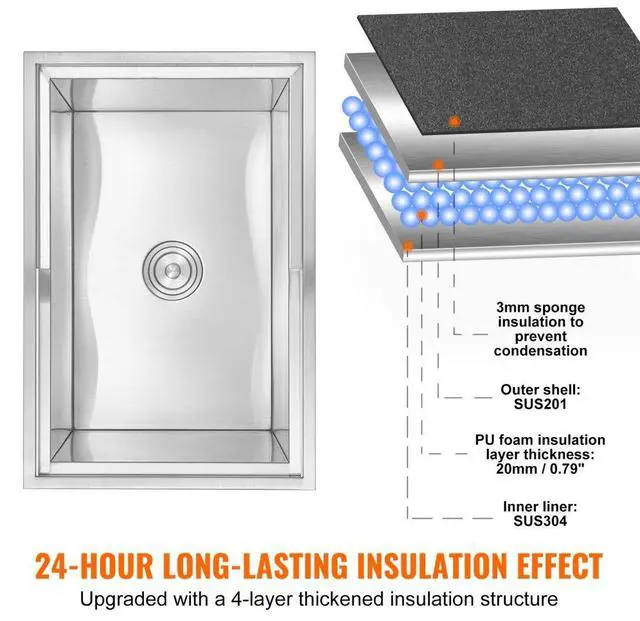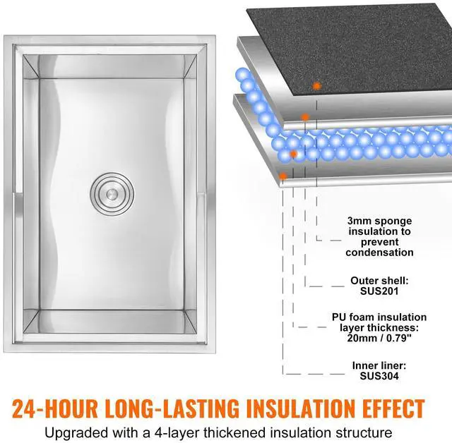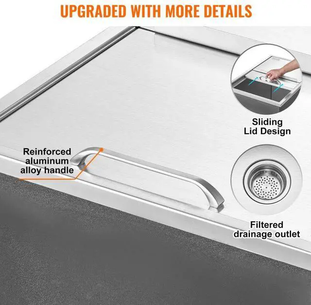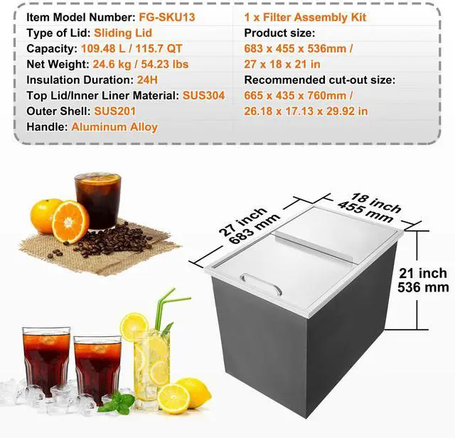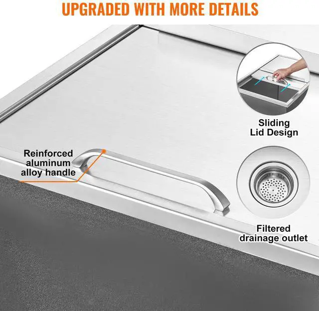 VEVOR Drop in Ice Chest, 27"L x 18"W x 21"H Stainless Steel Ice Cooler, Commercial Ice Bin with Sliding Cover, 40.9 qt Outdoor Kitchen Ice Bar, Drain-pipe and Drain Plug Included, for Cold Wine Beer
