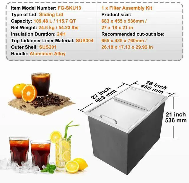 Top Lid/Inner Liner Material: SUS304,Capacity: 109.48L / 115.7QT,Item Model Number: FG-SKU13,Outer Shell: SUS201,Insulation Duration: 24H,Net Weight: 24.6 kg / 54.23 lbs,Handle: Aluminum Alloy