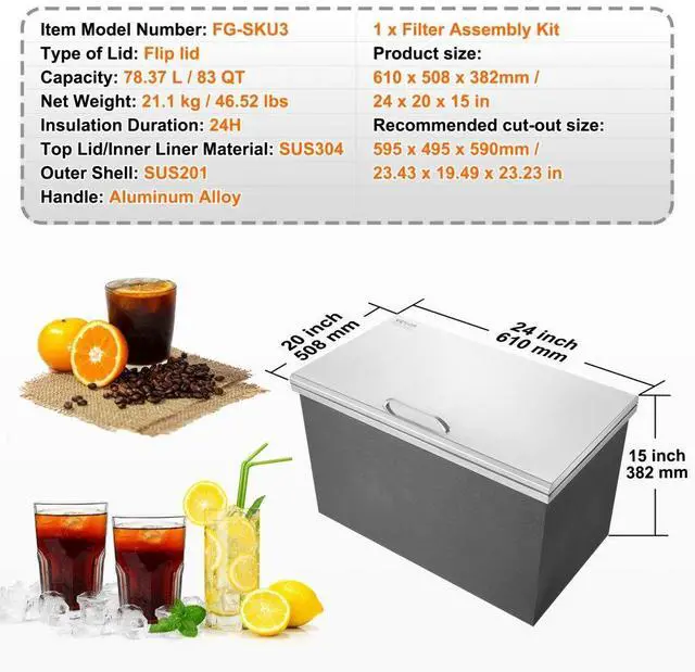 Top Lid/Inner Liner Material: SUS304,Capacity: 78.37L / 83 QT,Item Model Number: FG-SKU3,Outer Shell: SUS201,Insulation Duration: 24H,Net Weight: 21.1 kg / 46.52 lbs,Handle: Aluminum Alloy