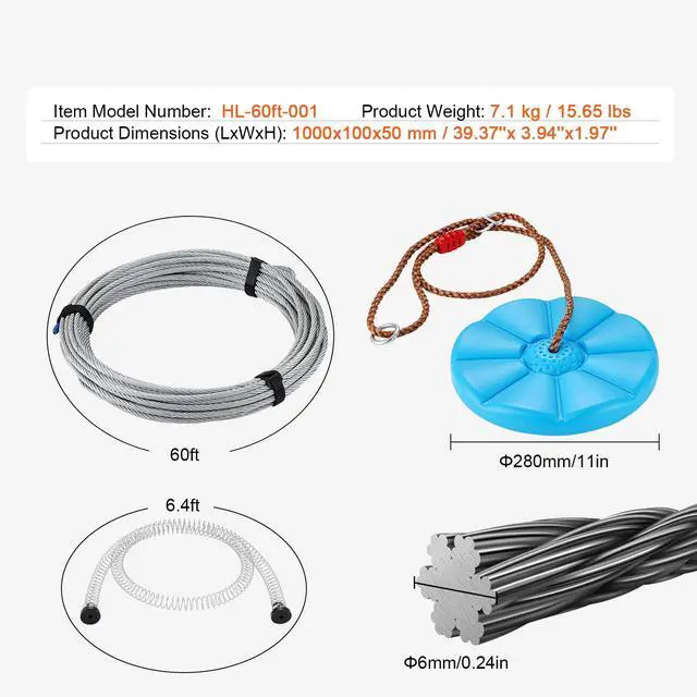 VEVOR Zipline Kit for Kids and Adult, 60 ft Zip Line Kits Up to 500 lb, Backyard Outdoor Quick Setup Zipline, Playground Entertainment with Stainless Steel Zipline, Spring Brake, Safety Harness, Seat