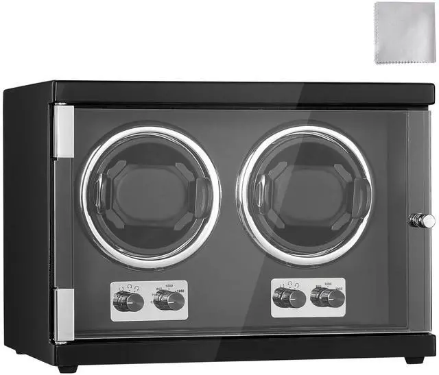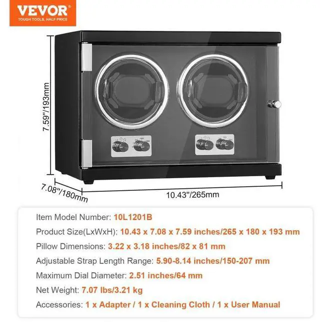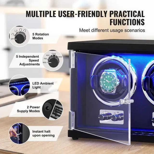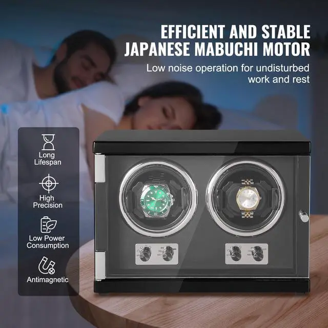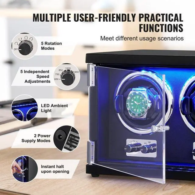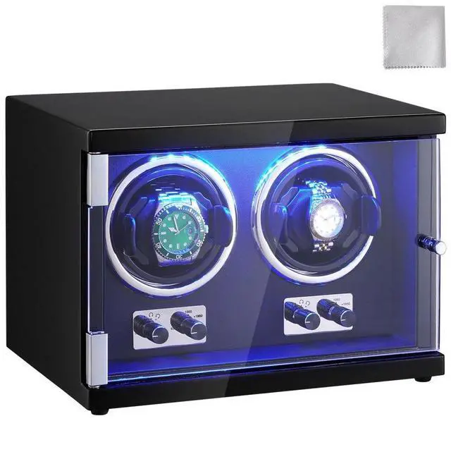 • VEVOR Watch Winder, Dual Watch Winder for Men's and Women's Automatic Watch, with 2 Super Quiet Japanese Mabuchi Motors, Blue LED Light and Adapter, High-Density Board Shell and Black PU