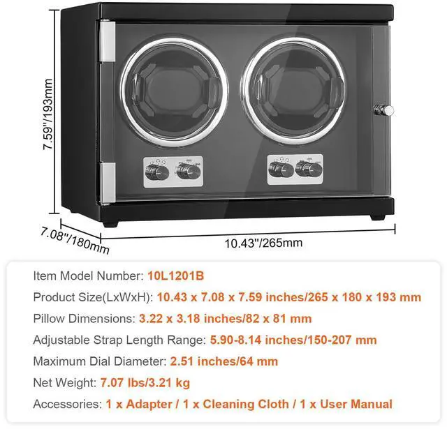 Pillow Dimensions: 3.22 x 3.18 inches/82 x 81 mm,Maximum Dial Diameter: 2.51 inches/64 mm,Item Model Number: 10L1201B,Material: High-Density Board + Acrylic,Adjustable Strap Length Range: 5.90-8.14 inches/150-207 mm,Net Weight:7.07 lbs/3.21 kg