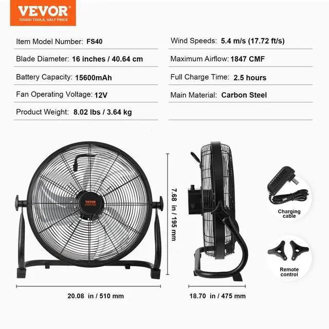 Blade Diameter: 16 inches / 40.64 cm,Battery Capacity: 15600 mAh,Fan Operating Voltage: 12V,Wind Speed: 5.4 m/s (17.72 ft/s),Model: FS40,Product Weight: 8.02 lbs / 3.64 kg,Full Charge Time: 2.5 hours,Maximum Airflow: 1847 CMF,Product Dimensions: 20.08 x 7.68 x 18.70 inches / 510 x 195 x 475 mm,Main Material: Carbon Steel
