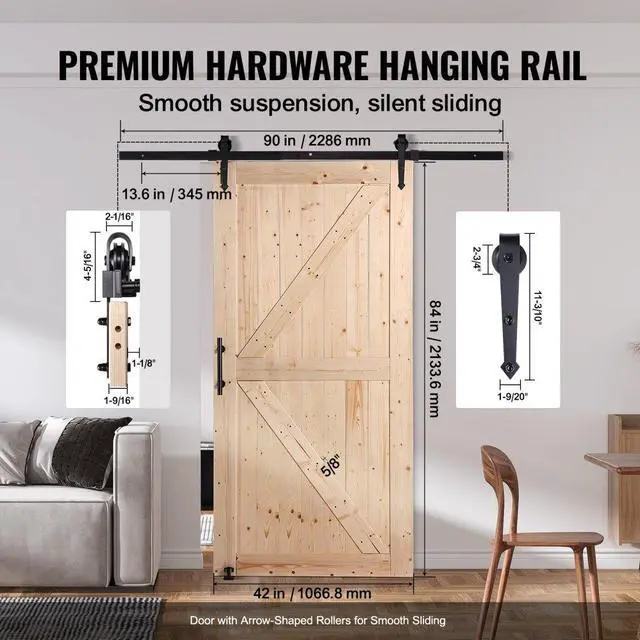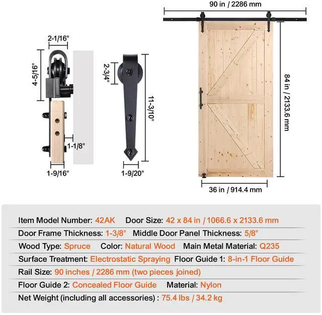Net Weight (including all accessories) : 75.4 lbs / 34.2 kg,Door Size: 42 x 84 inches / 1066.8 x 2133.6 mm,Main Metal Material: Q235,Middle Door Panel Thickness: 5/8",Item Model Number: 42AK,Door Frame Thickness: 1-3/8",Wood Type: Spruce,Rail Size: 90 inches / 2286 mm (two pieces joined)