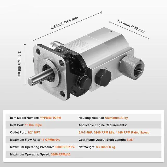 • VEVOR Hydraulic Log Splitter Pump, 11GPM, 2 Stage 3000PSI Wood Log Splitter Pump, 1'' Inlet 1/2'' NPT Outlet 3600 RPM Aluminum Hydraulic Gear Pump, for Small Engine Mounting Log Splitters Snowplow
