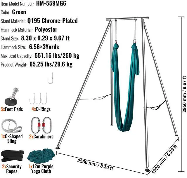 Hammock Material: Polyester,Hammock Size: 6.56 x 3 yards/6 x 2.6 m,Stand Material: Q195 Chrome-Plated,Color: Green,Item Model Number: HM-559MG6,Product Weight: 65.25 lbs/29.6 kg,Max Load Capacity: 551.15 lbs/250 kg,Stand Size: 8.30 x 6.3 x 9.68 ft/2530 x 1920 x 2950 mm