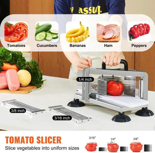 VEVOR Commercial Tomato Slicer, 1/4"+3/8"+3/16" Tomato Cutter Slicer, Stainless Steel Heavy Duty Tomato Slicer Machine, Manual Tomato Slicer with Non-slip Feet, Cutting Tomatoes, Cucumbers, Bananas