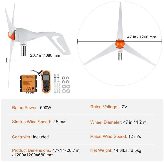 Noise Level: 55dB,Startup Wind Speed: 2.5 m/s,Rated Power: 500W,Number of Blades: 3,Wheel Diameter: 47 in / 1.2 m,Rated Wind Speed: 12 m/s,Controller: Included,Product Dimensions: 47 x 47 x 26.7 in / 1200 x 1200 x 680 mm,Net Weight: 14.3 lbs / 6.5 kg,Rated Voltage: 12V