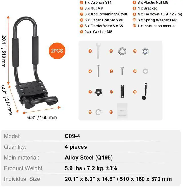 Individual Size: 20.1" x 6.3" x 14.6" / 510 x 160 x 370 mm,Product weight: 5.9 lbs / 7.2 kg, ±3%,Model: C09-4,Quantity: 4 pieces,Main Material: Alloy Steel (Q195)