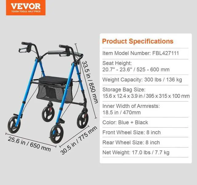 Storage Bag Size: 15.6 x 12.4 x 3.9 in / 395 x 315 x 100 mm,Weight Capacity: 300 lbs / 136 kg,Front Wheel Size: 8 inch,Rear Wheel Size: 8 inch,Inner Width of Armrests: 18.5 in / 470mm,Color: Blue + Black,Item Model Number: FBL427111,Seat Height: 20.7'' - 23.6'' / 525 - 600 mm,Product Dimensions: 30.5 x 25.6 x 33.5 in / 775 x 650 x 850 mm,Net Weight: 17.0 lbs / 7.7 kg