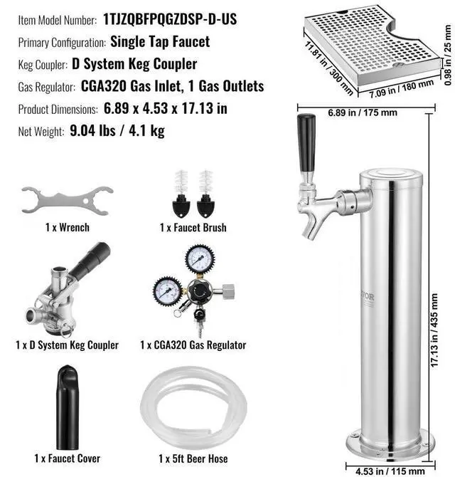 Gas Regulator: CGA320 Regulator,Keg Coupler: D System Keg Coupler,Item Model Number: 1TJZQBFPQGZDSP-D-US,Primary Configuration: Single Tap Faucet,Product Dimensions: 6.89 x 4.53 x 17.13 in / 175 x 115 x 435 mm,Net Weight: 9.04 lbs / 4.1 kg