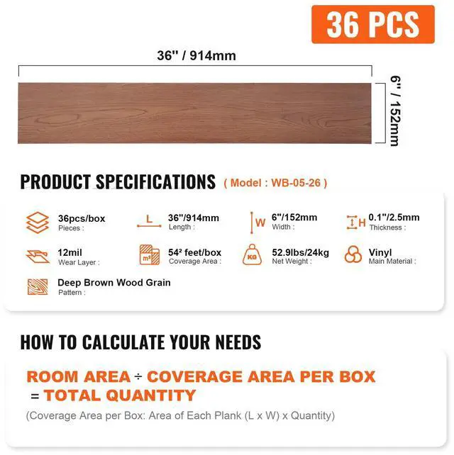 Pattern: Deep Brown Wood Grain,Length: 36''/914mm,Model: WB-05-26,Height: 0.1''/2.5mm,Coverage Area: 54²feet/box,Width: 6''/152mm,Net Weight: 52.9lbs/24kg,Wear Layer Thickness: 0.3mm/12mil,Main Material: Vinyl,Pieces: 36pcs/box