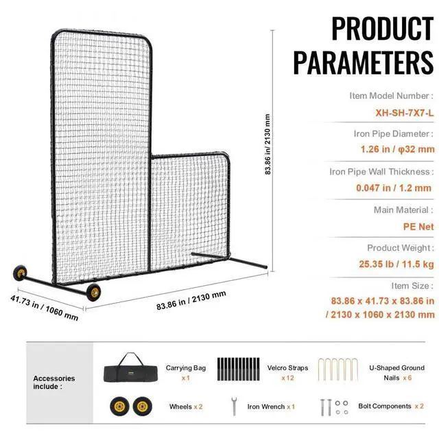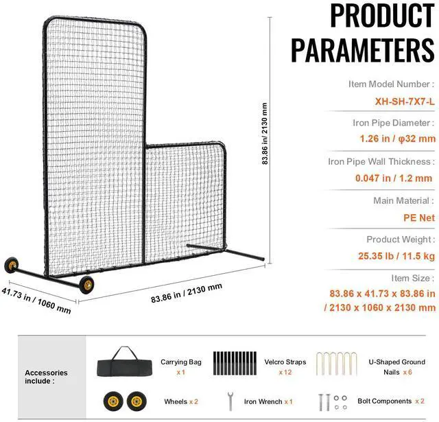 Iron Pipe Diameter: 1.26 inch / 32 mm,Iron Pipe Wall Thickness: 0.047 inch / 1.2 mm,Item Size: 83.86x41.73x83.86 inch / 2130x1060x2130 mm,Item Model Number: XH-SH-7X7-L,Product Weight: 25.35 lbs / 11.5 kg,Main Material: PE Net
