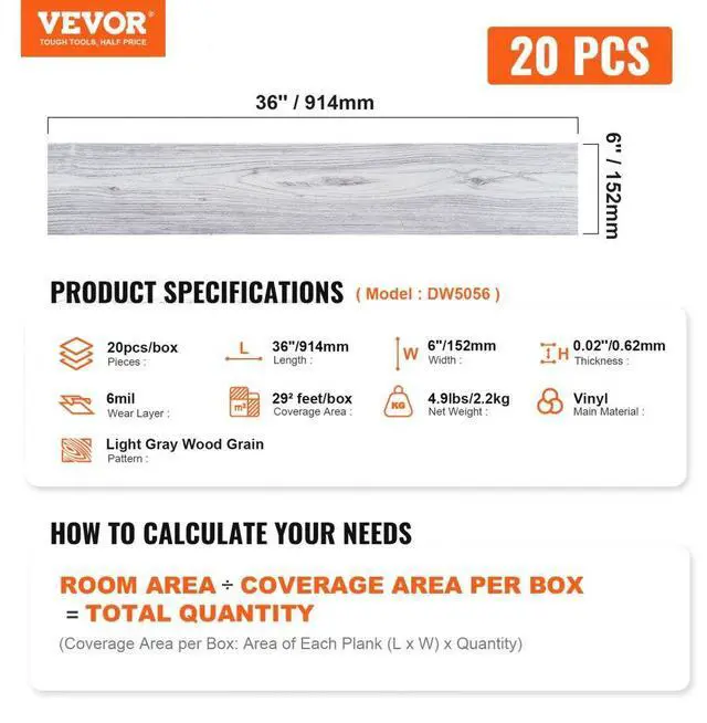Pattern: Light Gray Wood Grain,Length: 36''/914mm,Model: DW5056,Height: 0.02''/0.62mm,Coverage Area: 29² feet/box,Width: 6''/152mm,Net Weight: 4.9lbs/2.2kg,Wear Layer Thickness: 0.15mm/6mil,Main Material: Vinyl,Pieces: 20pcs/box