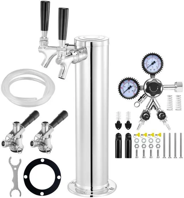 VEVOR Kegerator Tower Kit, Dual Taps Beer Conversion Kit, Stainless Steel Keg Beer Tower Dispenser with Dual Gauge CGA320 Regulator & D-System Keg Coupler, Self-Closing Spring for Party Bar Home