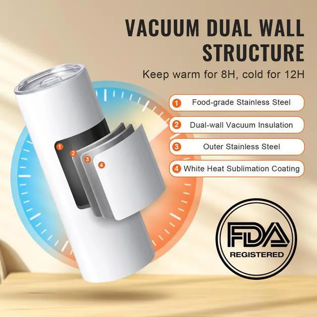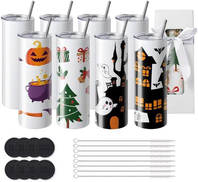 VEVOR 8 Pack Sublimation Tumblers 20 Oz Skinny Straight, Stainless Steel Sublimation Tumblers Blank, Stainless Steel Double Wall Tumbler for Heat Transfer Customized Gifts with Lid and Straw, Gift Box