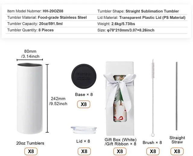 Tumbler Shape: Straight Sublimation Tumbler,Tumbler Quantity: 8 Pieces,Lid Material: Transparent Plastic Lid (PS Material),Item Model Number: HH-20OZ08,Tumbler Material: Food-grade Stainless Steel,Tumbler Capacity: 20 oz/591.5 ml,Weight: 2.6kg/5.73lbs
