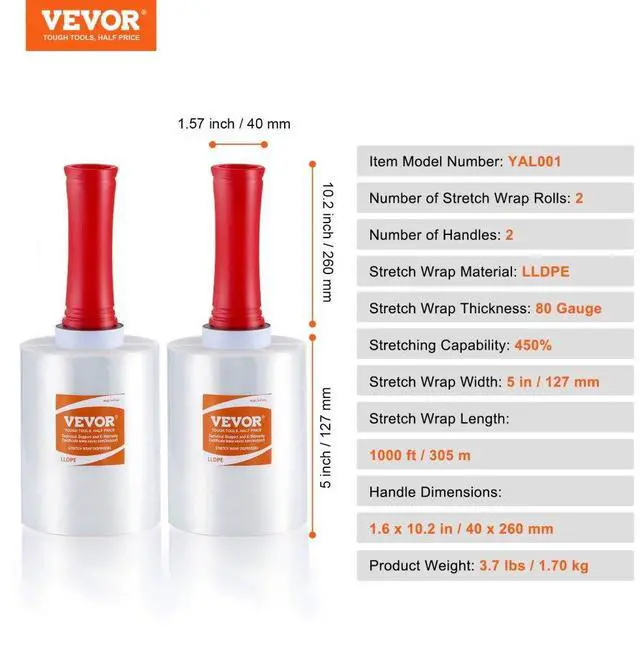 Number of Stretch Wrap Rolls: 2,Number of Handles: 2,Stretch Wrap Thickness: 80 Gauge,Stretch Wrap Length: 1000 ft/305 m,Stretch Wrap Width: 5 in/127 mm,Stretching Capability: 450%,Item Model Number: YAL001,Handle Dimensions: 1.6 x 10.2 in/40 x 260 mm,Product Weight: 3.7 lbs/1.70 kg,Stretch Wrap Material: LLDPE