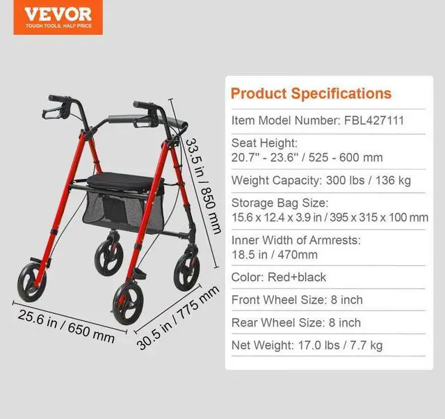 Storage Bag Size: 15.6 x 12.4 x 3.9 in / 395 x 315 x 100 mm,Weight Capacity: 300 lbs / 136 kg,Front Wheel Size: 8 inch,Rear Wheel Size: 8 inch,Inner Width of Armrests: 18.5 in / 470mm,Color: Red + Black,Item Model Number: FBL427111,Seat Height: 20.7'' - 23.6'' / 525 - 600 mm,Product Dimensions: 30.5 x 25.6 x 33.5 in / 775 x 650 x 850 mm,Net Weight: 17.0 lbs / 7.7 kg