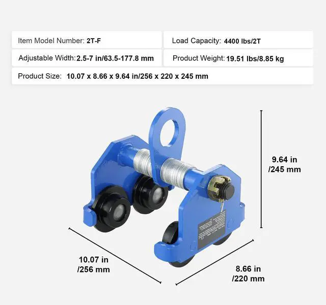 Load Capacity: 4400 lbs/2T,Item Model Number: 2T-F,Product Weight: 19.51 lbs/8.85 kg,Adjustable Width: 2.5-7 in/63.5-177.8 mm,Product Size: 10.07 x 8.66 x 9.64 in/256 x 220 x 245 mm