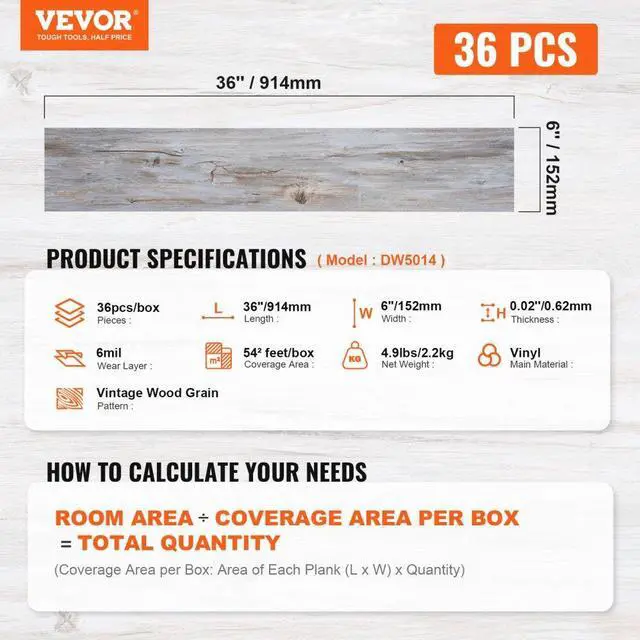 Pattern: Vintage Wood Grain,Length: 36''/914mm,Model: DW5014,Height: 0.02''/0.62mm,Coverage Area: 54² feet/box,Width: 6''/152mm,Net Weight: 8.7lbs/3.95kg,Wear Layer Thickness: 0.15mm/6mil,Main Material: Vinyl,Pieces: 36pcs/box